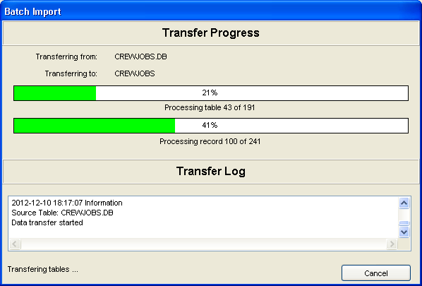 One the upgrade application has created a copy of the HireTrack NX database tables, the transfer process will begin and the data will be copied from the HireTrack Eclipse database to the HireTrack NX one.